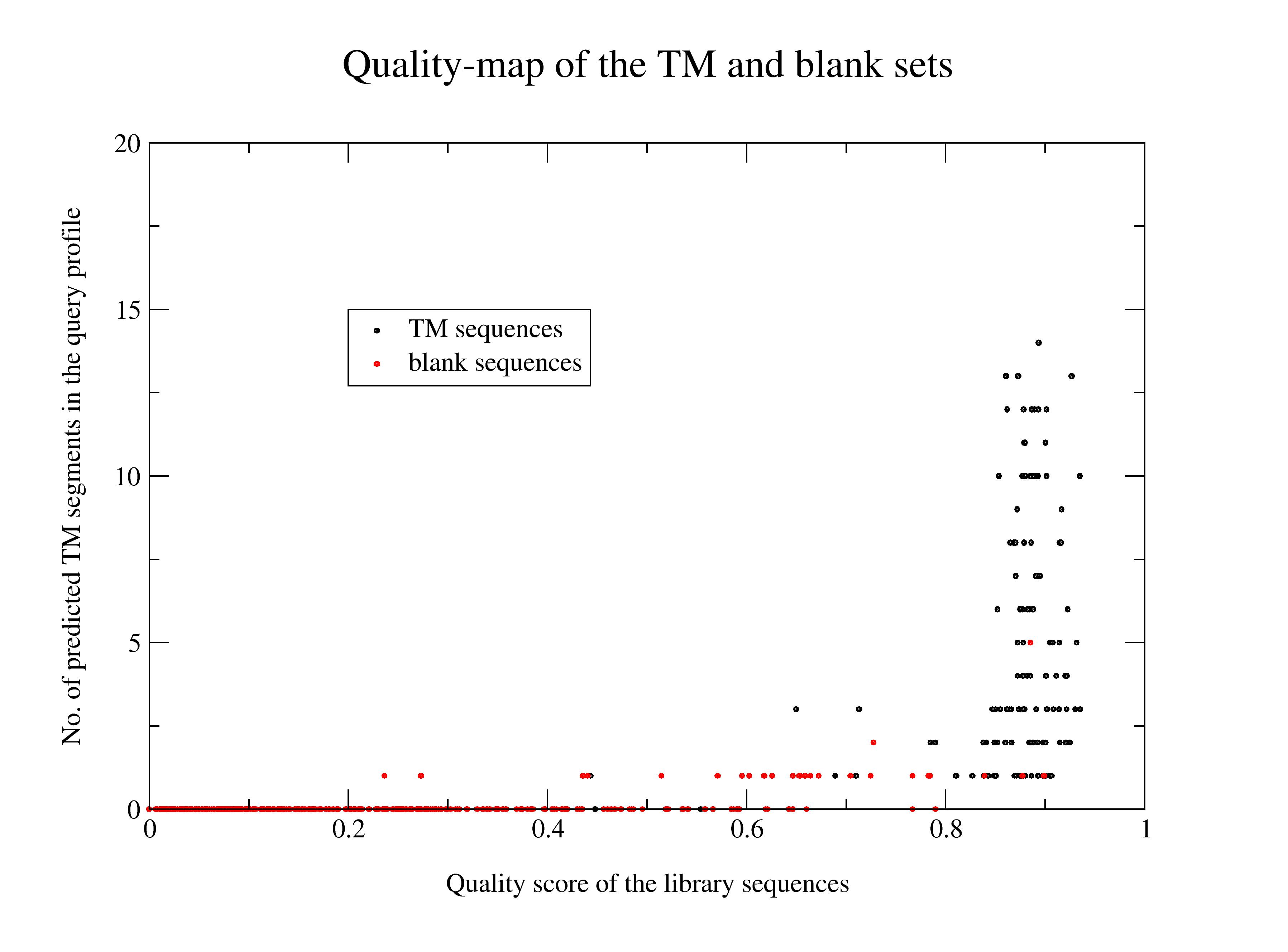 The effect of the type of the query sequence on the quality of the library sequences is demonstrated on the plot below. The predictive power of the library sequences relative to the annotation of the database at gradually increasing empirical cutoff value were computed. The black curve obtained using the TM-protein set as the query, while the red curve is the result of the non-TM query set. The quality overestimates the real efficiency at extremely low cutoff values. (See the red curve at 1.0 or below.)