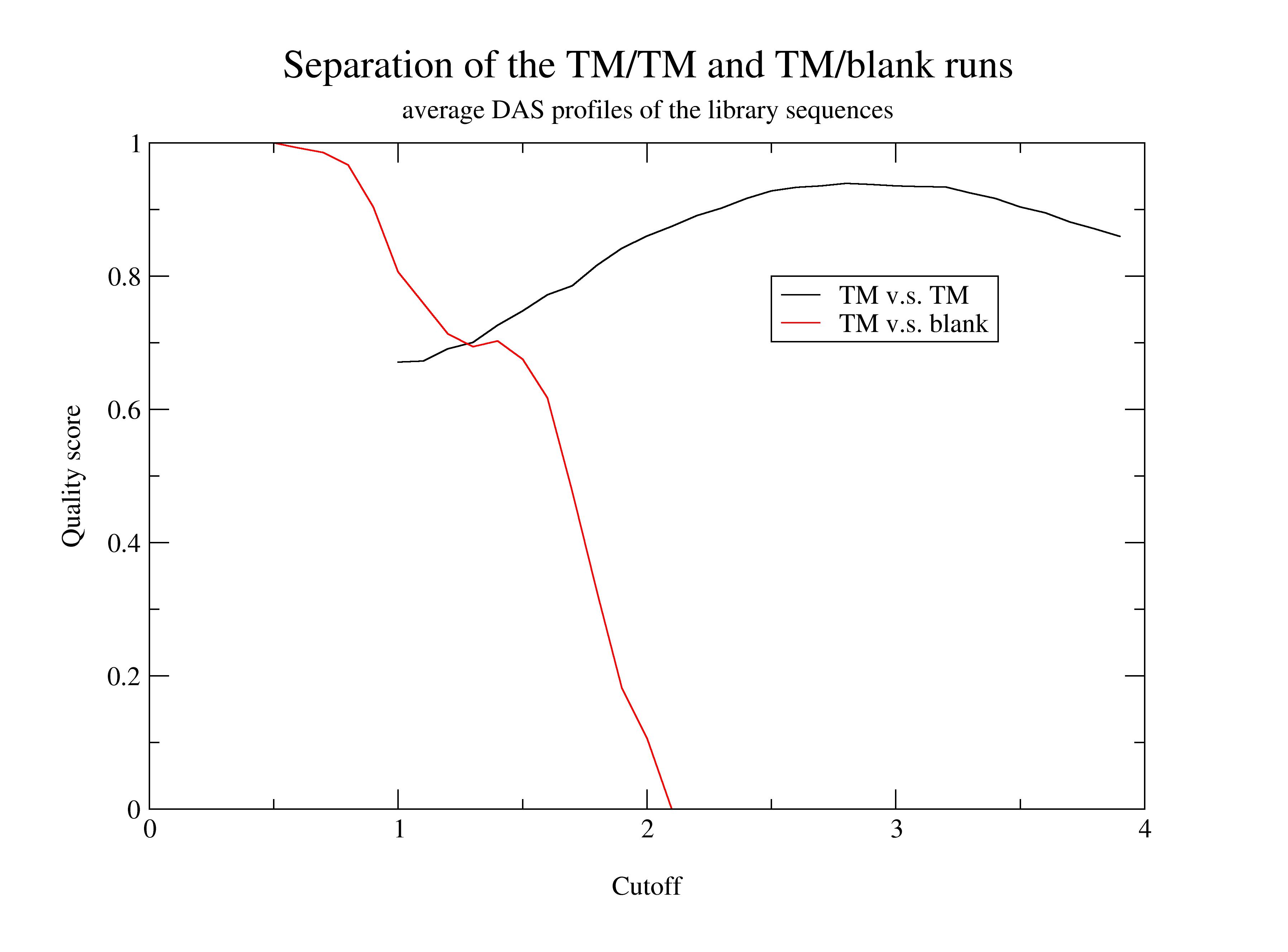 The principle difference between the DAS method and the hyrdophobicity profile based ones is that DAS describes the hydrophobic segments at tree levels. In the first intance an ideal TM fragment is similar to any other as they are all made up of hydrophobic residues. Secondly, if two fragments are similar then the similarity remains high even when the two fragments are shifted relative to each other. Finaly, when there are several TM fragments in both sequences we expect to see the grid-like arrengaments of similarity regions at the intersections of the TM fragments. This complex approach of hydrophobicity is the key behind the sensitivity of the DAS method.